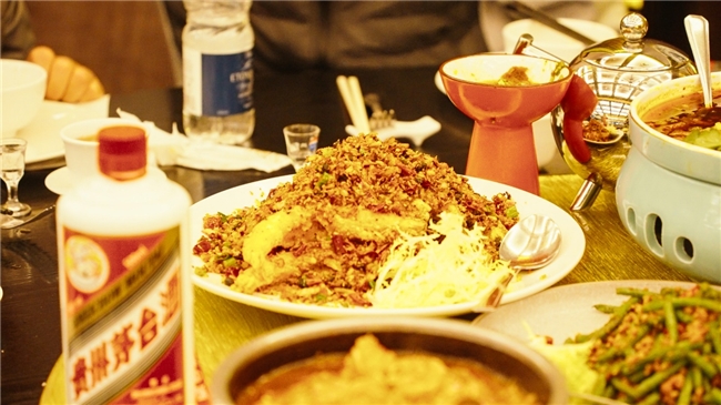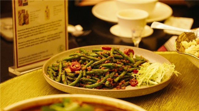 在餐饮设计上,皇朝餐饮团队以中式佳肴为主线,融合节庆与地域特色,构筑出与飞天茅台相呼应的味觉旅程。开席以清爽前菜启程,衬托茅台酱香的纯净与细腻;随后,北京填鸭与姜葱龙虾面以香酥与鲜美展现丰盈口感,在咸香与酒香间交织出层次的平衡。水煮牛肉片与 XO酱豆腐煲的辛香浓郁,映衬出酒体的醇厚与回甘。尾声以避风塘炒虾与扬州炒饭收结,风味温润,余韵悠长。整场宴席在菜肴与佳酿的和谐对话中展开,一味一景,皆成篇章。