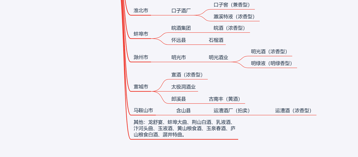 其他:龙舒宴、蚌埠大曲、荆山白酒、乳液酒、汴河头曲、玉液酒、黄山粮食酒、玉泉春酒、庐山粮食白酒、潺井特曲。