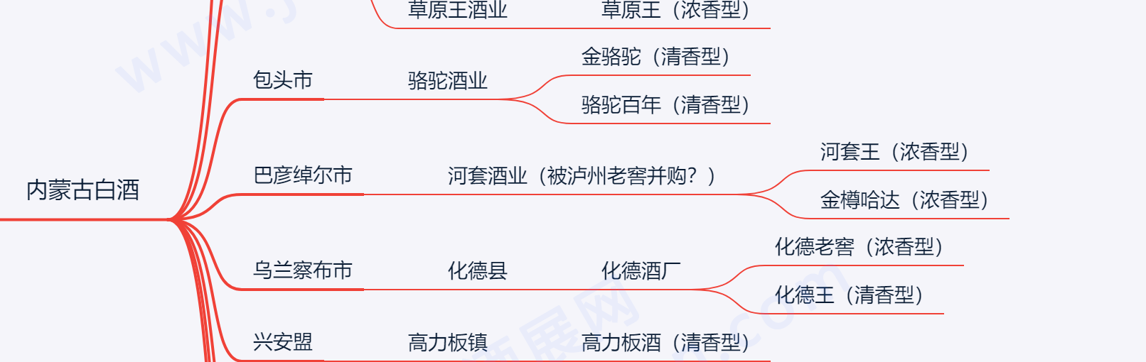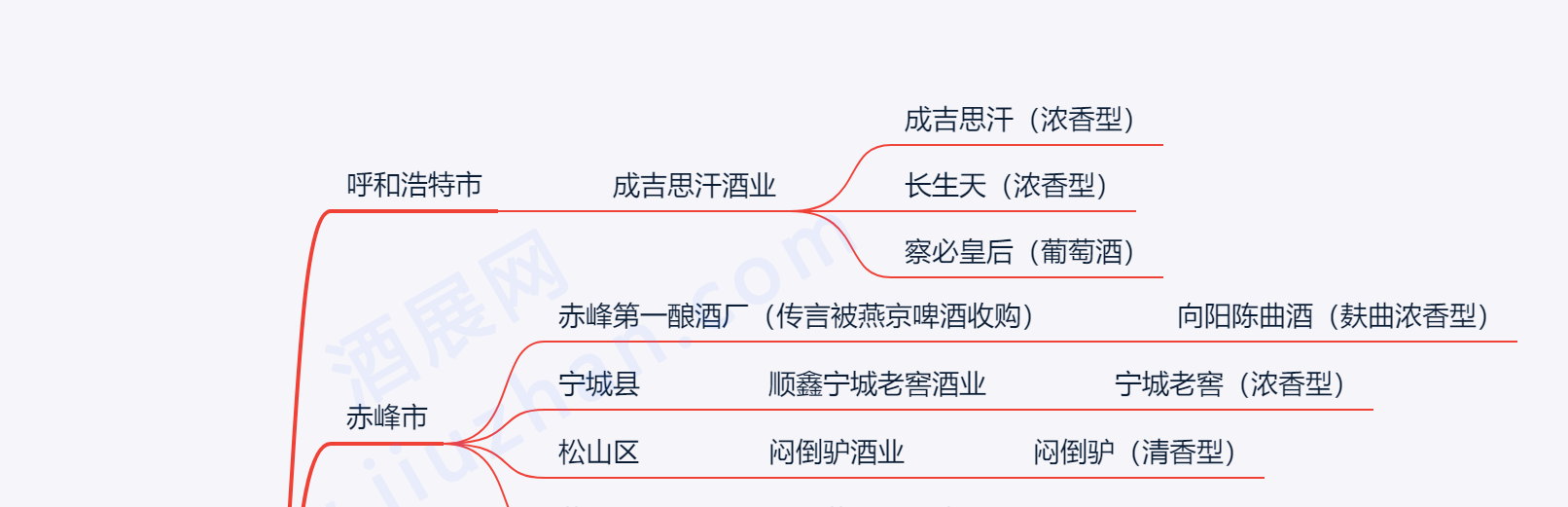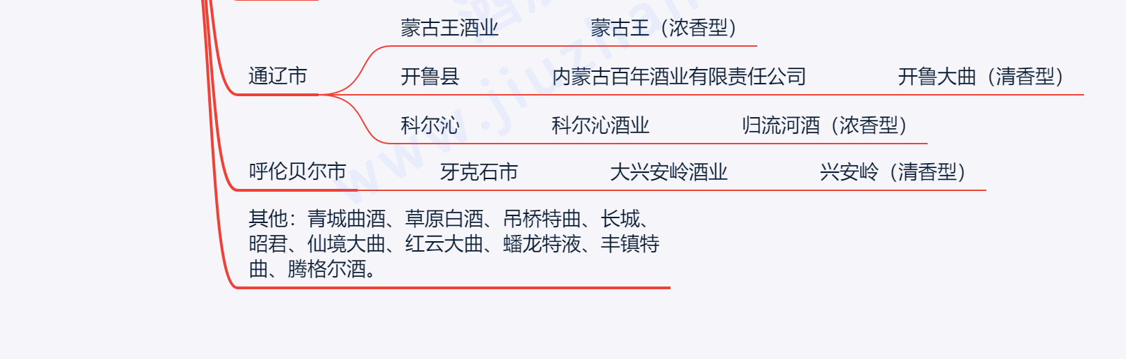 其他:青城曲酒、草原白酒、吊桥特曲、长城、昭君、仙境大曲、红云大曲、蟠龙特液、丰镇特曲、腾格尔酒。