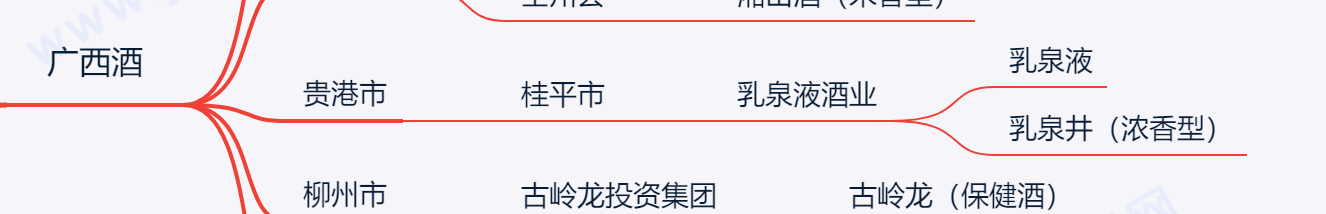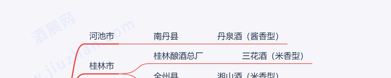 广西的白酒较少,主要是米酒,桂林三花酒是典型代表。 河池市 • 南丹县 • 丹泉酒(酱香型) 桂林市 • 桂林酿酒总厂 • 三花酒(米香型) • 全州县 • 湘山酒(米香型) 贵港市 • 桂平市 • 乳泉液酒业 • 乳泉液 • 乳泉井(浓香型) 柳州市 • 古岭龙投资集团 • 古岭龙(保健酒) 其他:神蜉酒、红兰酒、乌猿酒、三蛇酒、桂花酿。