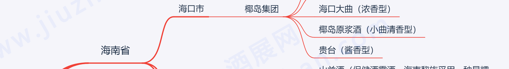 海南因其地理位置,人文风俗的特殊性,产的酒主要是露酒或者保健酒。 海口市 • 椰岛集团 • 椰岛鹿龟酒(保健酒) • 椰岛海王酒(保健酒) • 海口大曲(浓香型) • 椰岛原浆酒(小曲清香型) • 贵台(酱香型) 屯昌县 • 仙昌酒业 • 山兰酒(保健酒露酒,海南黎族采用一种旱糯稻(山兰稻米)酿制而得名) 琼中县 • 黎村酒业 • 黎村佳酿