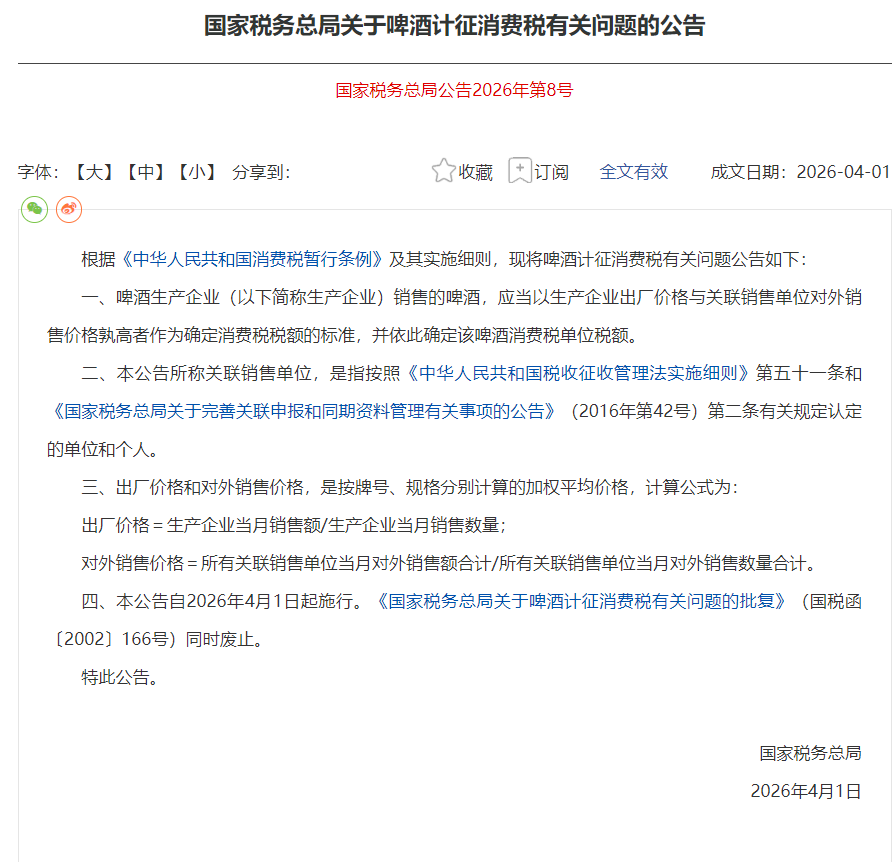 四、本公告自2026年4月1日起施行。《国家税务总局关于啤酒计征消费税有关问题的批复》(国税函〔2002〕166号)同时废止。