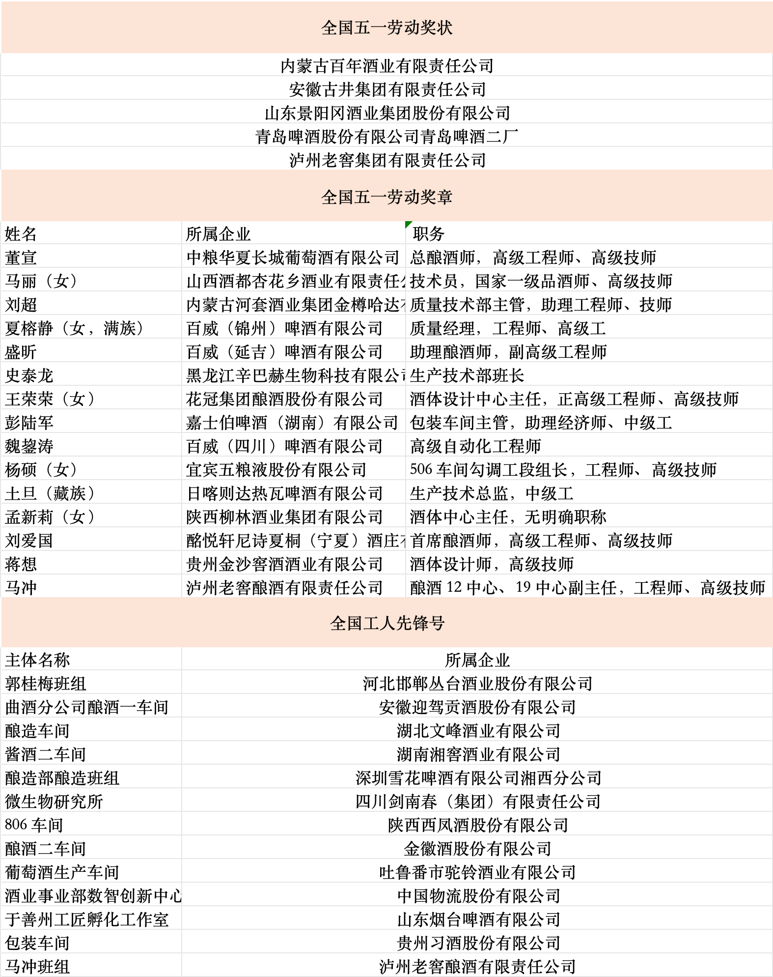 4月9日,中华全国总工会发布通知,对2026年全国五一劳动奖拟表彰对象予以公示,公示时间从2026年4月9日起,至4月13日止。 此次公示名单中,酒业有5家企业拟获全国五一劳动奖状,15名职工拟获全国五一劳动奖章,13个集体拟获全国工人先锋号荣誉(顺序依照名单)。